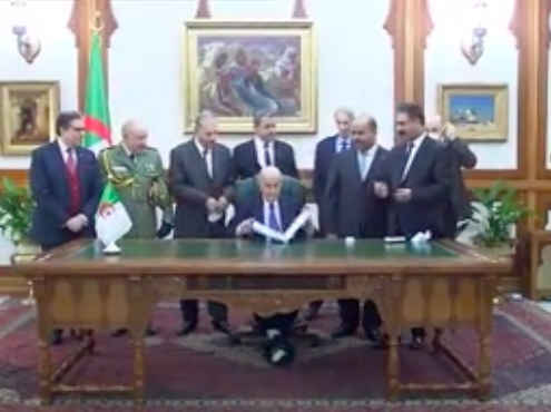 La signature a eu lieu en présence du président du Conseil de la Nation par intérim, Salah Goudjil, du président de l’Assemblée Populaire Nationale (APN), Slimane Chenine, du Premier ministre, Abdelaziz Djerad et du chef d’Etat-major de l’Armée nationale populaire (ANP), le général de Corps d’Armée, Saïd Chanegriha, a précisé le communiqué.
