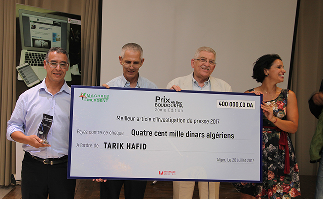 Doté de 400.000 dinars, le prix Ali Bey Boudoukha du meilleur article d’investigation, a été décerné hier soir au journaliste indépendant algérien, Tarek Hafid. Le jury a décidé de primer son article, paru dans Le Soir d’Algérie du 15 février 2017 et intitulé « Industrie de phosphate – Un engagement de 15 milliards de dollars avec une entreprise fantôme ».