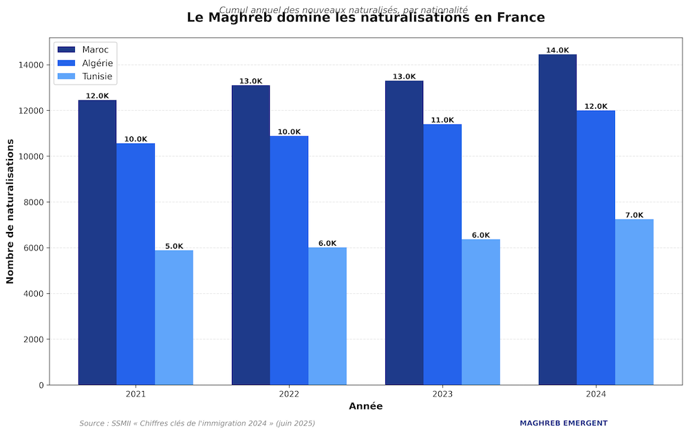 Paris peut bien serrer la vis sur les visas, cela n’empêche pas les naturalisations de progresser. Les Algériens restent la deuxième nationalité la plus naturalisée, derrière les Marocains (14 454, +8,7 %) et devant les Tunisiens (7 250, +13,9 %). À eux trois, les ressortissants du Maghreb totalisent 32 % des 105 000 acquisitions de nationalité enregistrées en 2024.