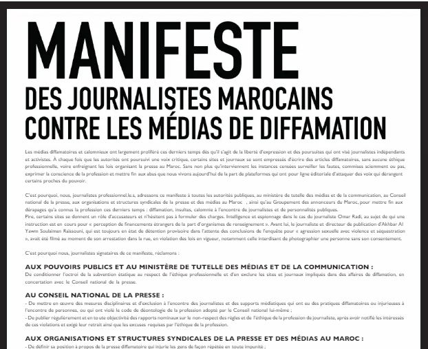 Issus autant de la presse francophone qu’arabophone, ces journalistes dénoncent les campagnes calomnieuses et de diffamation engagées par certains médias, « dès qu’il s’agit de poursuites engagées contre des journalistes indépendants et des activistes ».« A chaque fois que les autorités ont poursuivi une voix critique, certains sites et journaux se sont empressés d’écrire des articles diffamatoires, sans aucune éthique professionnelle, voire enfreignant les lois organisant la presse au Maroc », peut-on lire dans le manifeste.