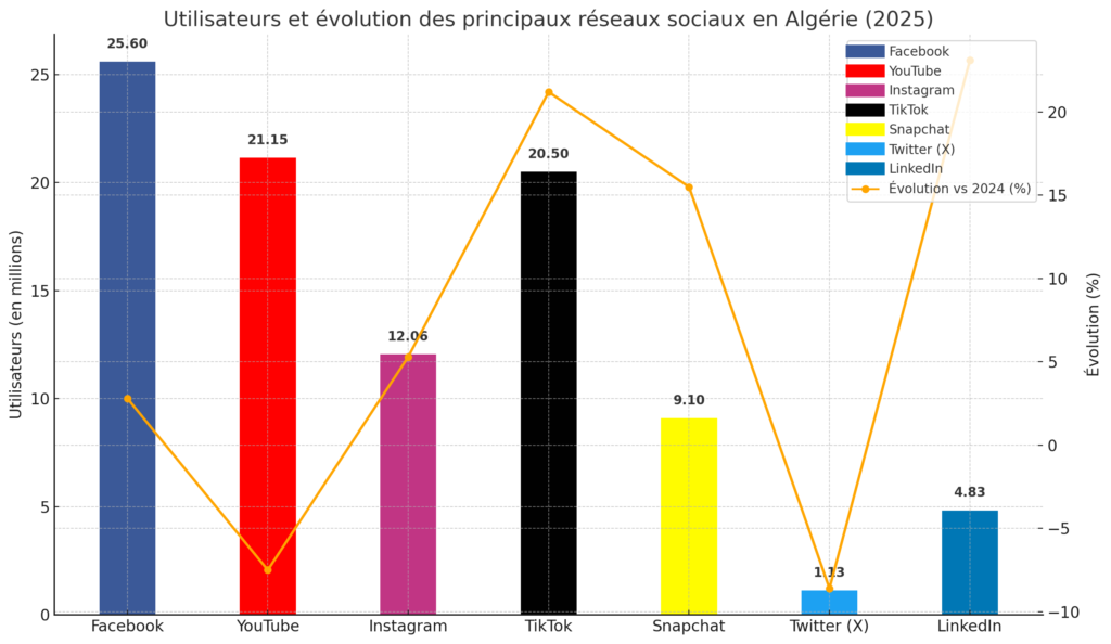 Selon les dernières données de DataReportal, « Digital 2025: Algeria« , janvier 2025, l’écosystème des réseaux sociaux en Algérie connaît une expansion constante, avec 25,6 millions d’utilisateurs actifs représentant 54,2% de la population totale.